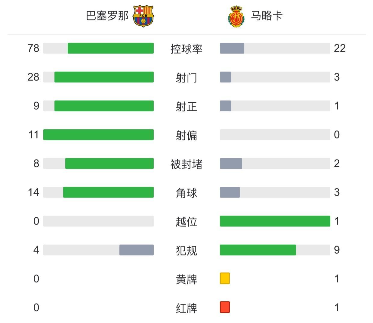 关键事件: 开场50秒,巴萨闪击得手!莱万弧顶精彩后脚跟给到加维横敲法蒂推射空门得手,巴萨1-0马洛卡。