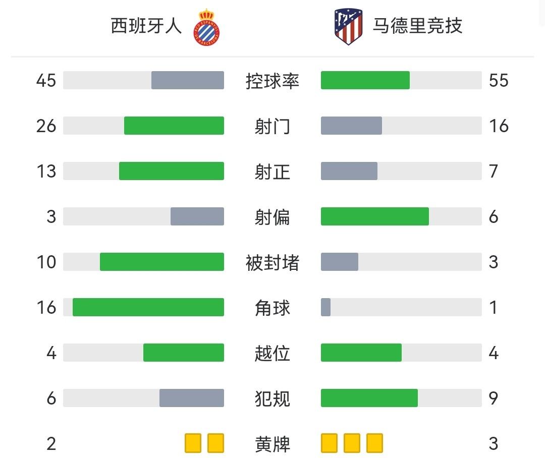 最终全场比赛结束,西班牙人主场3-3马竞。