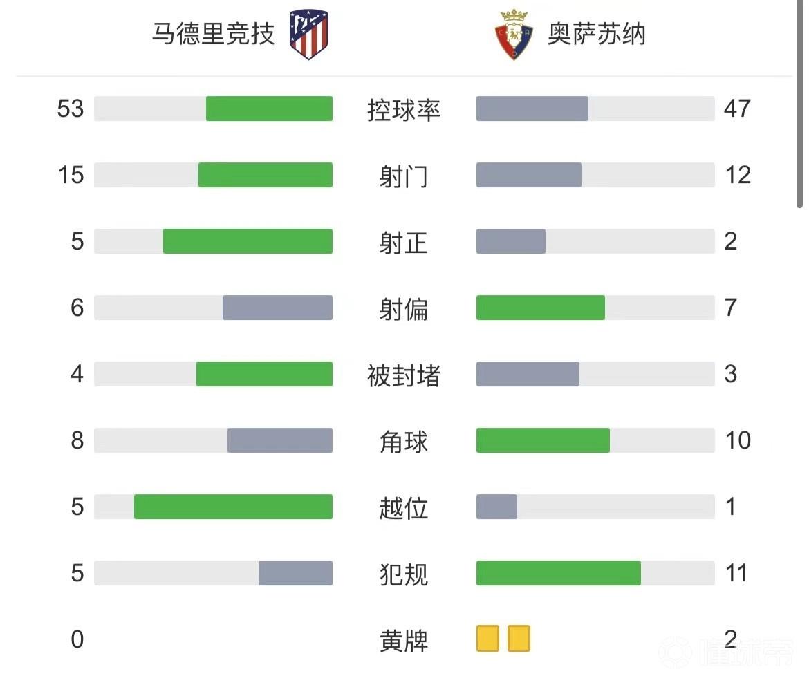 关键事件: 第44分钟,马竞取得进球!反击机会格列兹曼右路横传禁区卡拉斯科推射破门,马竞1-0奥萨苏纳。