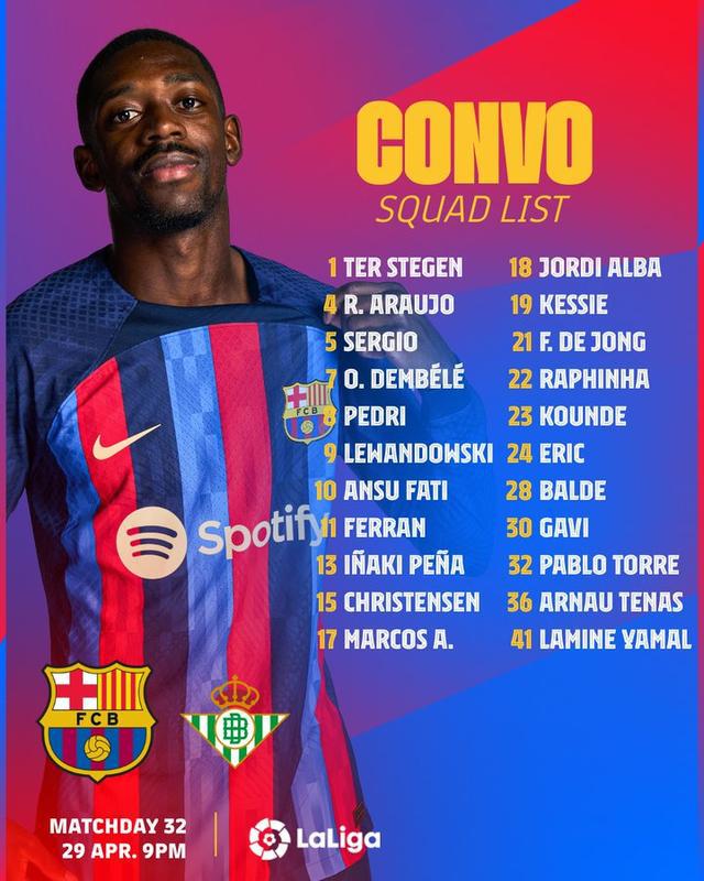JRS直播网讯 巴萨官方公布了西甲第32轮主场对阵贝蒂斯的比赛大名单,登贝莱、克里斯滕森伤愈回归,均获得队医出战许可,布斯克茨解禁复出,15岁小将亚马尔连续3场比赛入选。比赛将于北京时间4月30日3:00进行。