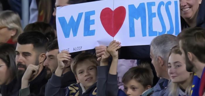此前在国王杯次回合0-4输给皇马的比赛,巴萨现场接近10万的球迷就在第10分钟齐声高歌梅西的名字。并且摆出了致敬膜拜的手势。而今天他们如法炮制,再次在第10分钟做了相同的举动,有小球迷甚至还举着“我们爱梅西”的标语。