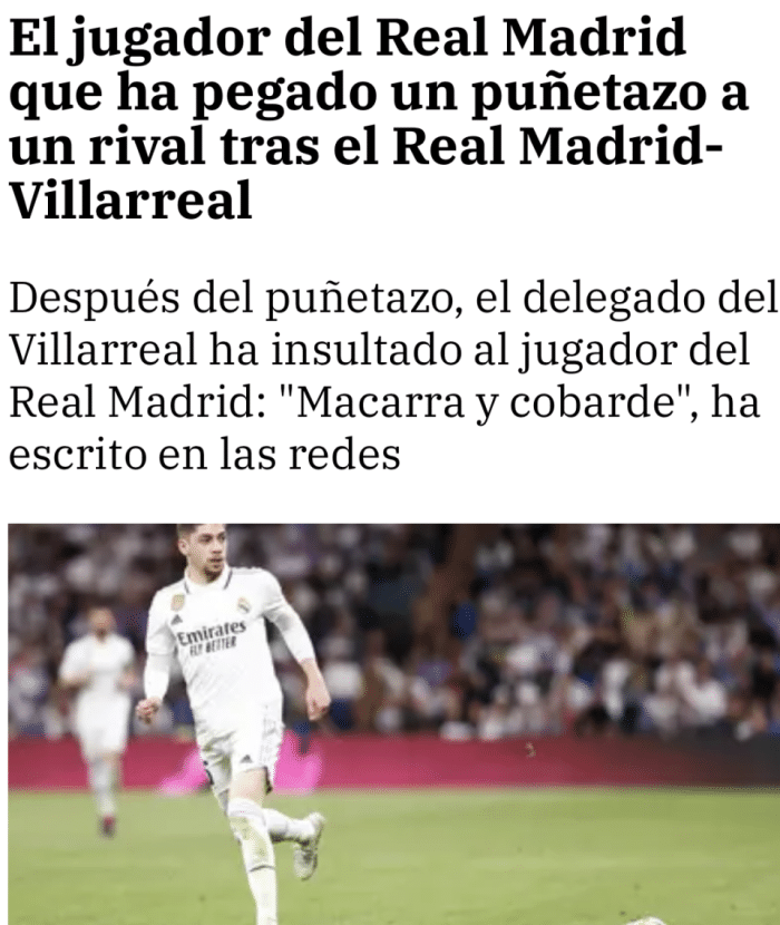 JRS直播网04月09日讯 ,来自西班牙六台的最新消息,在输给比利亚雷亚尔的赛后,皇马阵中的乌拉圭中场巴尔韦德,打了比利亚雷亚尔球员巴埃纳,记者Mario Cortegana也确认了这一消息。