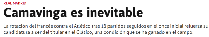 《阿斯报》称,安切洛蒂之所以没有让卡马文加在马德里德比中首发,是因为希望他留力国王杯对阵巴萨的比赛。