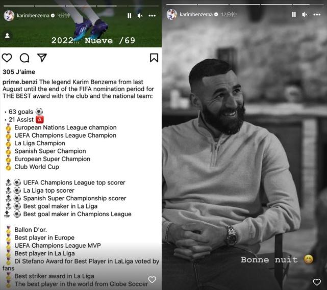 JRS直播网讯03月01日,皇马巨星本泽马在个人社交账号上晒出了一张照片,内容是FIFA年度最佳提名期间,他在俱乐部和国家队的进球助攻数据以及各类荣誉,以此来公开表达自己对于FIFA年度最佳球员评选结果的不满。