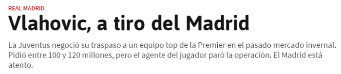 JRS直播网02月2日讯 据西班牙媒体《阿斯报》报道,皇马可能在今夏签下尤文的塞尔维亚中锋弗拉霍维奇。