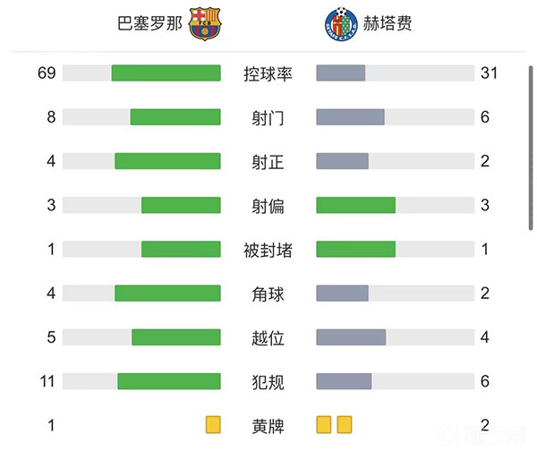 全场比赛结束,最终巴塞罗那1-0赫塔费6分领跑!