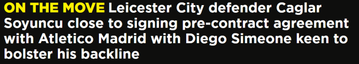 JRS直播网01月04日讯 据英国媒体talksport报道,马竞将今夏免签莱斯特城的土耳其中卫瑟云聚。