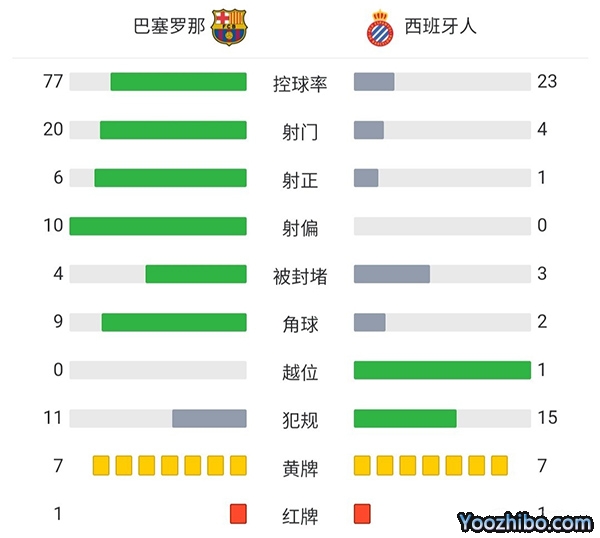 巴萨1-1西班牙人 拉奥斯狂出15黄2红阿隆索破门何塞卢点射