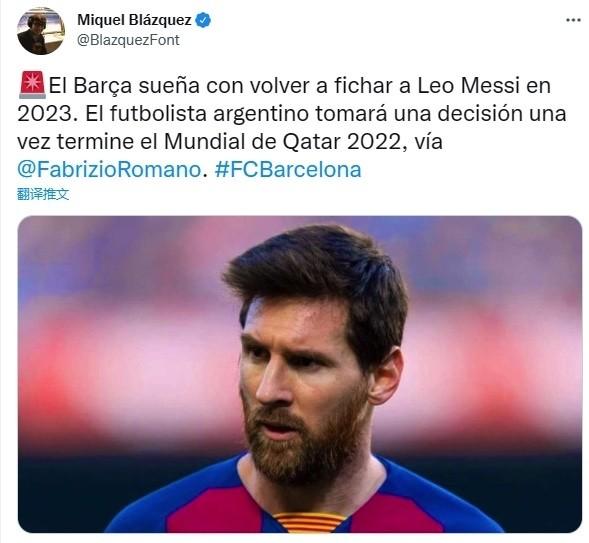 JRS直播网09月23日,来自知名记者Miquel Blazquez的透露,西甲豪门巴塞罗那希望能在2023年的夏天重新签回梅西,而梅西本人将会在世界杯结束后,再决定自己的未来。
