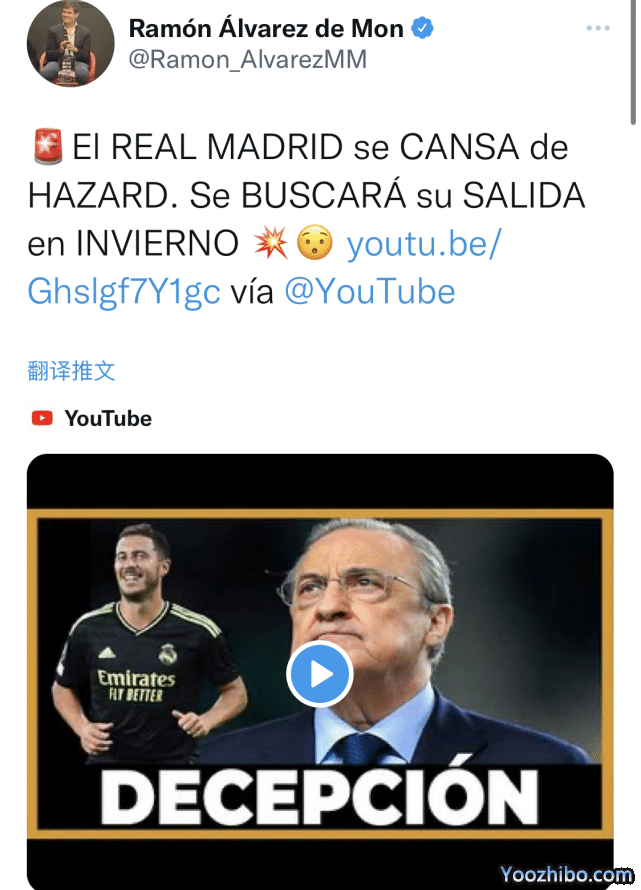 JRS直播网09月13日尽管皇马新赛季开局强势7连胜,但队内依然有不少失意人。除了“王储”阿森西奥,阿扎尔也是其中之一。北京时间9月13日,来自为《马卡报》、GOL等多家西媒供职的名记Ramón Álvarez的最新消息,皇马高层已经对阿扎尔非常失望和厌倦,他们彻底放弃了拯救比利时人的想法。将在冬窗不惜一切代价,也要送走这位水货7号。