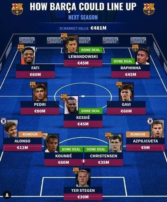 德国《转会市场》就曝光了新赛季巴萨的主力阵容,5大新援在列,两位切尔西边后卫同样上榜。这套主力阵容身价高达4.81亿欧元。门将位置不出意外,依然会是德国国门特尔斯特根,后卫线从左至右分别是阿隆索、孔德、克里斯滕森和阿兹皮利奎塔。巴萨一个夏窗就换掉了整条后卫线的首发。替补席,巴萨还有阿劳霍、阿拉巴、埃里克加西亚、皮克等备选。