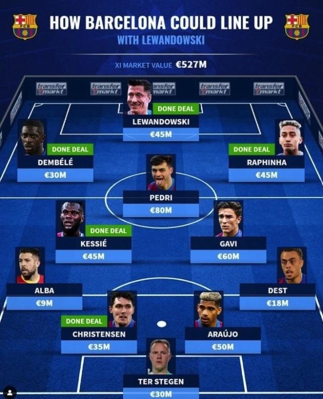 JRS直播网07月17日讯 凌晨,巴萨官方宣布与拜仁就莱万多夫斯基的转会达成了协议。待球员通过体检并且签约完成后,就将正式加盟。而在莱万正式成为巴萨球员后,德国《转会市场》也列出了巴萨新赛季的4-3-3首发强阵,而这11人身价总额高达4.47亿欧元。