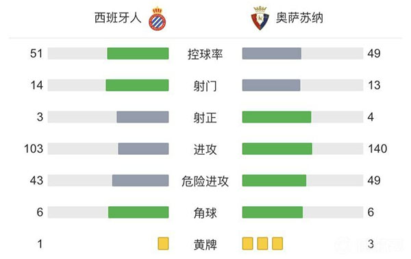 全场比赛结束,西班牙人1-1战平奥萨苏纳。