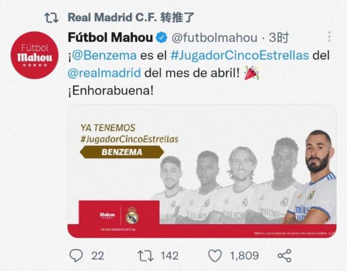 官方转发了合作伙伴Mahou的动态,本泽马获得4月队内最佳球员。