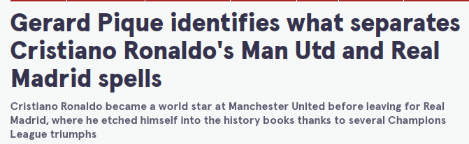 C罗在皇马拿到了4座欧冠,还有西甲和国王杯冠军。皮克表示:“他在曼联更多地踢边锋,所以更多地专注于观赏性。在皇马他开始踢前锋,更像一个终结者。”