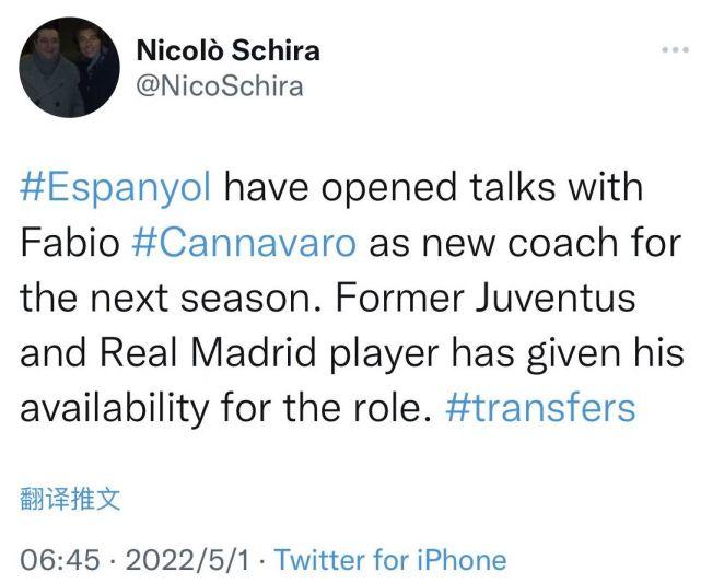 JRS直播网05月01日讯 ,来自斯基拉、迪马济奥等多位欧洲足坛转会专家的最新消息,西班牙人正在考虑今夏换帅,他们有意邀请前恒大主帅卡纳瓦罗下赛季执教球队。