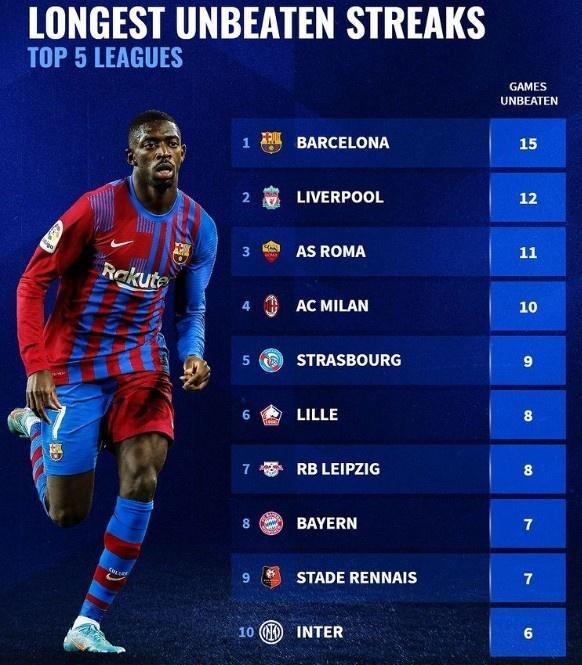 JRS直播网04月11日讯 消息,德国转会市场统计了欧洲五大联赛当前赛季不败榜单,巴塞罗那以15场不败领跑。