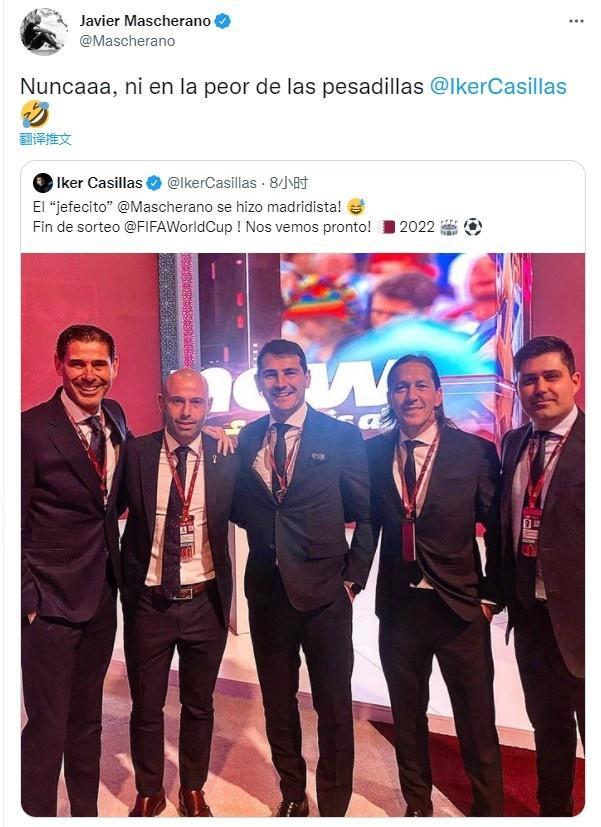 JRS直播网04月03日讯 消息,卡西利亚斯晒照调侃马斯切拉诺是马德里人,小马哥回复“在噩梦里也不可能”。
