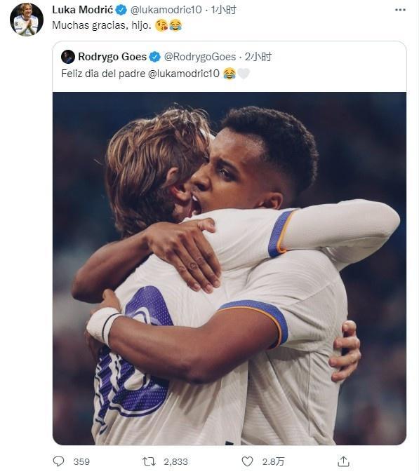 罗德里戈今年21岁,他在个人推特上祝队内老大哥、36岁的莫德里奇父亲节快乐,魔笛回应:“非常感谢,儿子!”