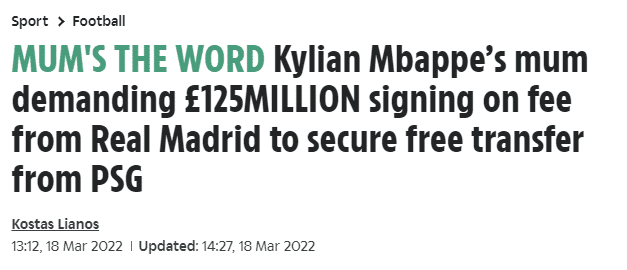 姆巴佩和巴黎的合同今夏到期,多家媒体称他将自由加盟皇马。OkDiario主管爱德华多-英达透露:“姆巴佩将成为皇马球员。”