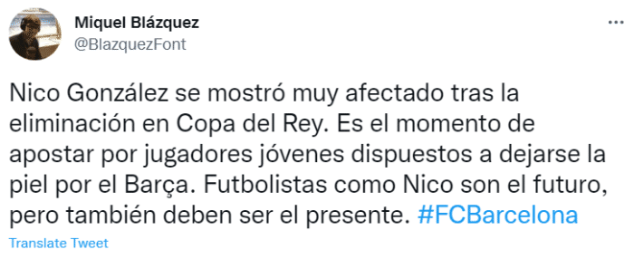 该记者表示,巴萨在国王杯被毕尔巴鄂竞技淘汰后,尼科-冈萨雷斯显得非常沮丧,巴萨现在是时候将赌注压在这些愿意为球队付出一切的小将身上了。