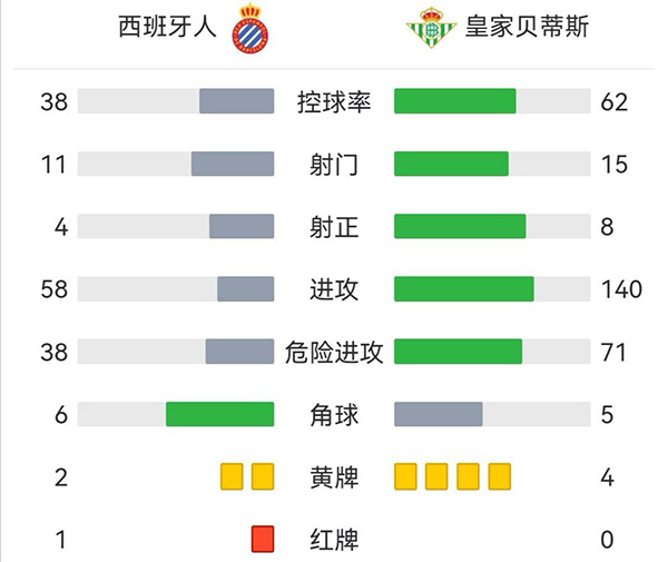 全场比赛结束,西班牙人主场1-4不敌贝蒂斯。