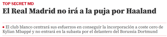 《世体》表示,虽然姆巴佩也愿意加盟皇马,但不代表皇马在转会市场上就没有竞争对手,比如巴黎就不会轻易放弃与这位法国国脚续约,因此银河战舰将会专注于签下姆巴佩,从而不加入到哈兰德的争夺战。