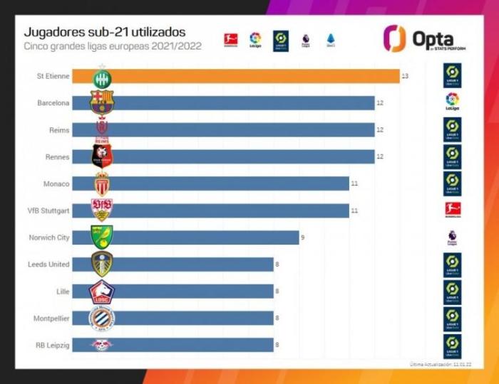JRS直播网01月12日讯 ,著名数据网站Opta统计了本赛季五大联赛使用U21球员的榜单,圣埃蒂安13人高居榜首,巴萨、兰斯和雷恩12人并列第二。