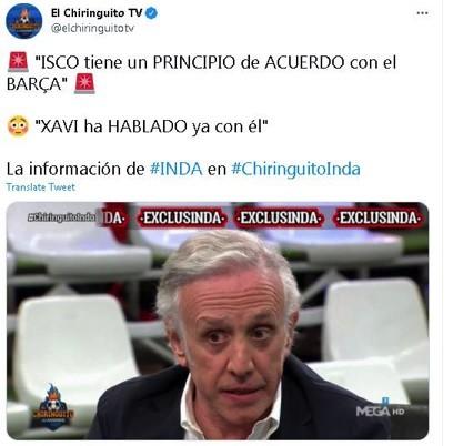 JRS直播网01月11日讯 ,前《马卡报》主编因达在西班牙电视六台的《沙滩酒吧》节目中,透露出一则猛料,那就是效力于皇马的中场伊斯科,已经和巴萨达成了基本协议。他将成为继路易斯-恩里克之后,又一位从皇马直接转会巴萨的“叛徒”。
