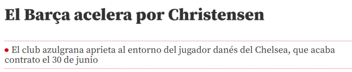巴萨方面认为,切尔西中卫克里斯滕森就符合这些特点,巴萨愿意给这名丹麦中卫送上一份4+1的合同。由于克里斯滕森与切尔西的续约谈判陷入僵局,因此巴萨方面便加快了与他谈判的步伐。