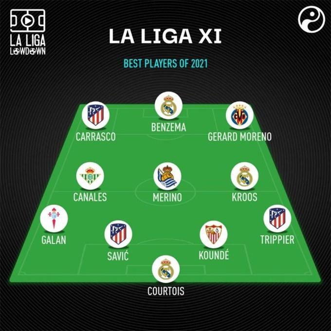 JRS直播网01月01日讯 Squawka统计了西甲联赛2021年年度最佳阵容,皇马和马竞各有3人入选,巴萨则意外的无人入选。