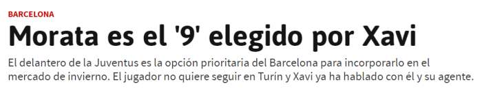 《阿斯报》甚至还表示,莫拉塔是巴萨主帅哈维在中锋位置上的第一人选。