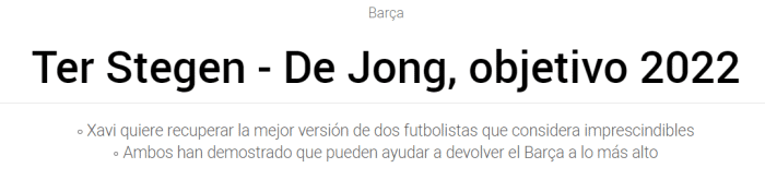 JRS直播网12月27日讯 据西班牙媒体《每日体育报》报道,巴萨主帅哈维在2022年的首个目标是帮助特尔施特根和德容恢复状态。