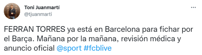 随后该记者再次发布报道,费兰-托雷斯正在瓦伦西亚训练,他希望以一个良好的状态接受巴萨的体检。