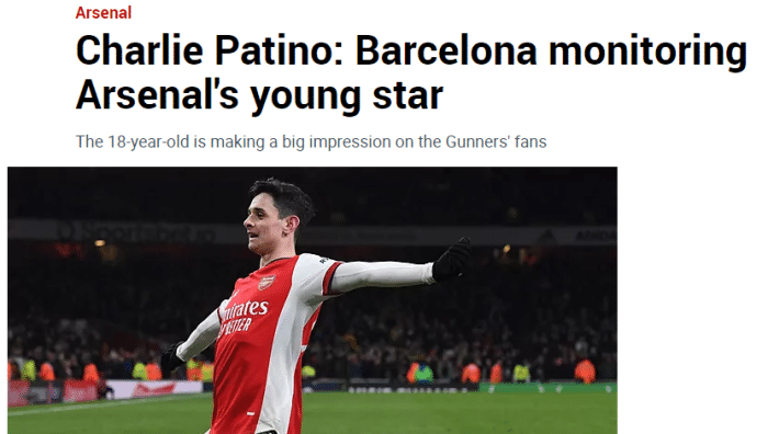 JRS直播网12月26日讯 据《马卡报》报道,巴萨正在关注阿森纳小将查理-帕蒂诺。