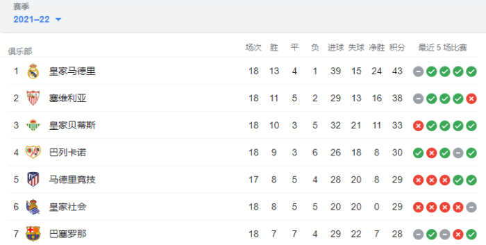 JRS直播网12月22日讯 西甲半程结束,皇马43分排名第一拿到半程冠军。