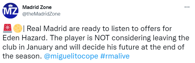 米格尔-安赫尔-迪亚斯表示,皇马已经对这名比利时球星失去了耐心,球队准备听取针对阿扎尔的报价。但要出售阿扎尔并不容易,他薪水极高,而且球员不打算冬窗离队,他要等到夏季再考虑自己的未来。