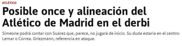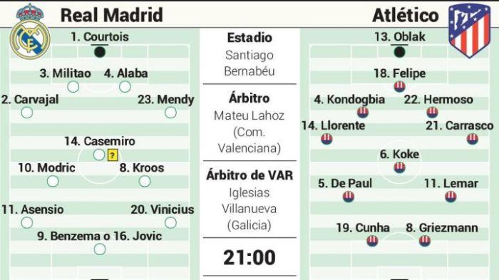 根据《阿斯报》的预测,虽然本泽马已经伤愈可以出战,但出于保险起见,安切洛蒂可能还是会选择先让约维奇首发;马竞方面,苏亚雷斯应该会先在板凳席待命。