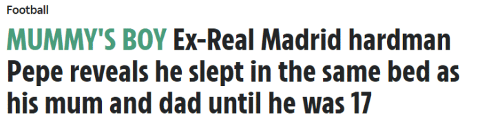 JRS直播网12月11日讯 据英国媒体《太阳报》援引葡萄牙媒体TribunaExpresso报道,前皇马中卫佩佩在接受采访时表示,自己在17岁前都和父母在一张床睡觉。