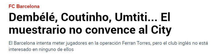 JRS直播网讯 据西班牙媒体《马卡报》报道,巴萨想用乌姆蒂蒂、库蒂尼奥、登贝莱或朗格莱中的一位加钱交换费兰-托雷斯,但曼城方面没有兴趣。
