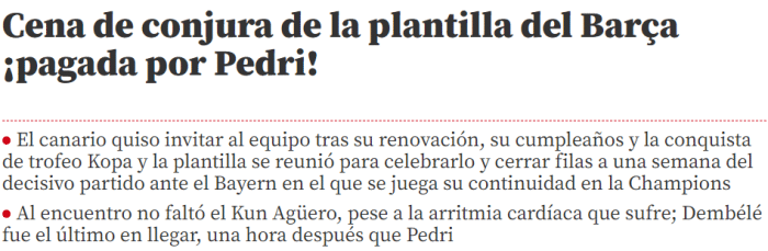 为了庆祝自己最近续约、生日和赢得科帕奖,佩德里出钱请巴萨全队到市中心的一家餐厅吃饭团建,主帅哈维非常支持这个决定,认为在客战拜仁的比赛前有机会团建是一次非常好的提升团队凝聚力的机会。