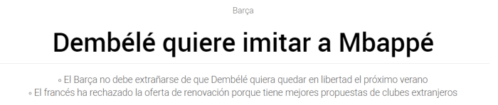 《每体》表示,有国外的俱乐部给登贝莱开出了一份非常好的合同,除了在工资待遇上比目前巴萨给出的续约合同要高外,这家俱乐部还将额外给登贝莱2000万欧元的签字费,因此球员拒绝与巴萨续约。