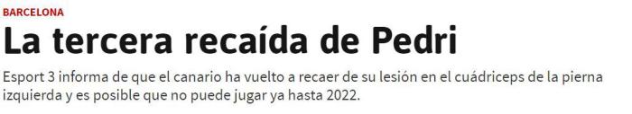 JRS直播网11月20日讯 据西班牙媒体《阿斯报》报道,佩德里将不会出战加泰德比。
