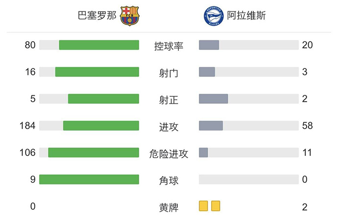 全场比赛结束,巴塞罗那1-1阿拉维斯。