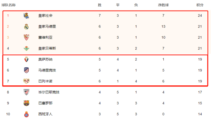 登上积分榜第一的是皇家社会,该队算是本赛季西甲最大的黑马,11轮比赛7胜3平·负,欧联杯小组赛3轮1胜2平排名第二,开赛季在首轮西甲2-4输给巴萨之后连续13场比赛不败,包括西甲7胜3平,欧两边1胜2平,双线暴走成为西甲现阶段状态最好的球队,本轮西甲2-0击败了塞尔塔,上一轮则2-2西甲冠军马竞,该场比赛一度压着马竞踢,可惜在2-0领先的情况下被苏亚雷斯连追两球。