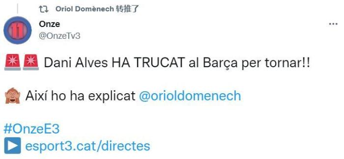 JRS直播网10月16日讯 据记者OriolDomènech报道,巴西老将阿尔维斯近日主动联系老东家巴萨,表达了回归意愿。