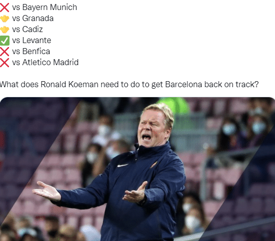 JRS直播网10月03日讯 根据数据统计,巴萨最近6场各项赛事只取得1场胜利,状态相当糟糕。