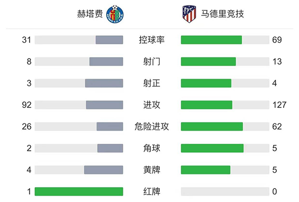 全场比赛结束,马竞2-1逆转绝杀赫塔菲。