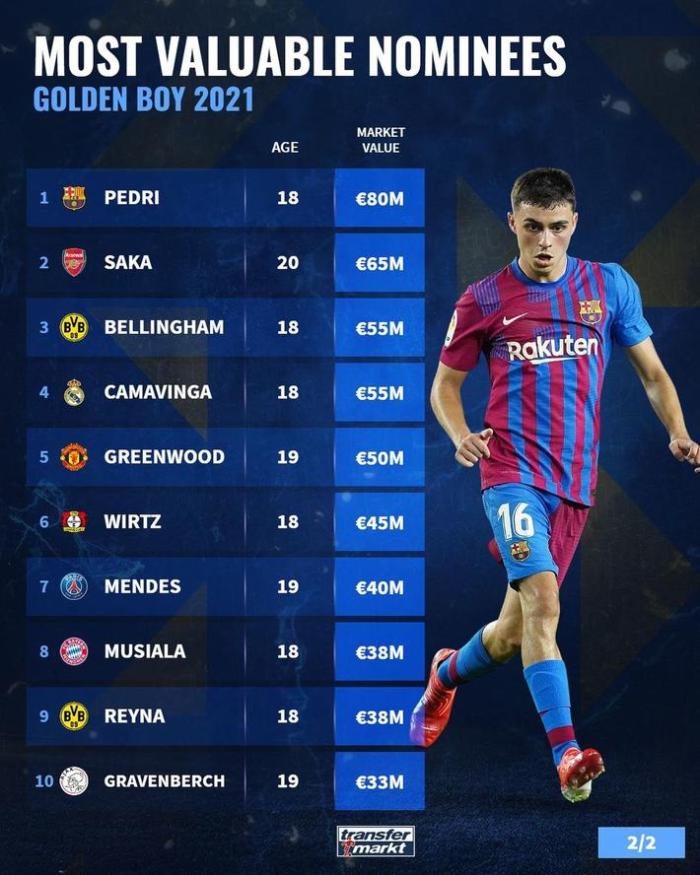 JRS直播网9月20日讯 此前,《都灵体育报》公布了金童奖入围的40名球员名单。今日,德转也列出了名单中身价排名前20的球员,其中佩德里以8000万欧元的身价位居首位。