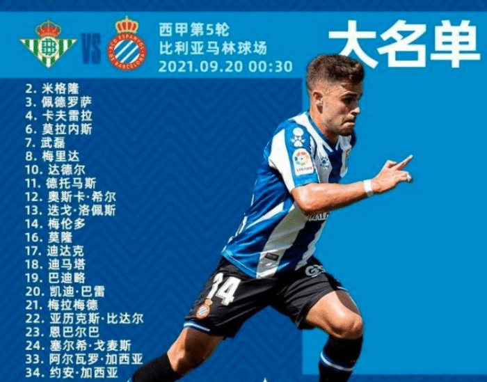 此次对话,西班牙人雪上加霜,确认“残阵”出击,3名首发主力缺席,分别是普阿多、大卫-洛佩斯、卡莱罗,他们全都没有出现在比赛大名单之中,已经获得了官宣确认。官方确认本场比赛的大名单共计22人,由德托马斯、莫隆、恩巴尔巴等人领衔,由于常规首发主力上赛季打进13球助攻8次的普阿多缺席,武磊基本确认将登场比赛,他重回比赛阵容,但是大概率还是替补登场,莫隆和迪马塔首发作用会更大。